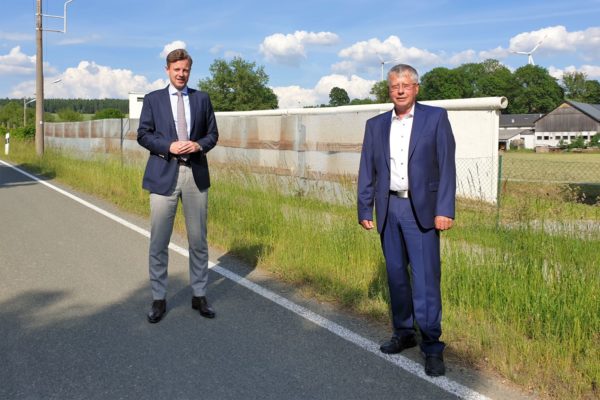 Bild: Der Zweckverbandsvorsitzende Dr. Oliver Bär (links) gratuliert dem neu gewählten stellvertretenden Vorsitzenden Landrat Thomas Fügmann am Freigelände des Deutsch-Deutschen Museums in Mödlareuth.