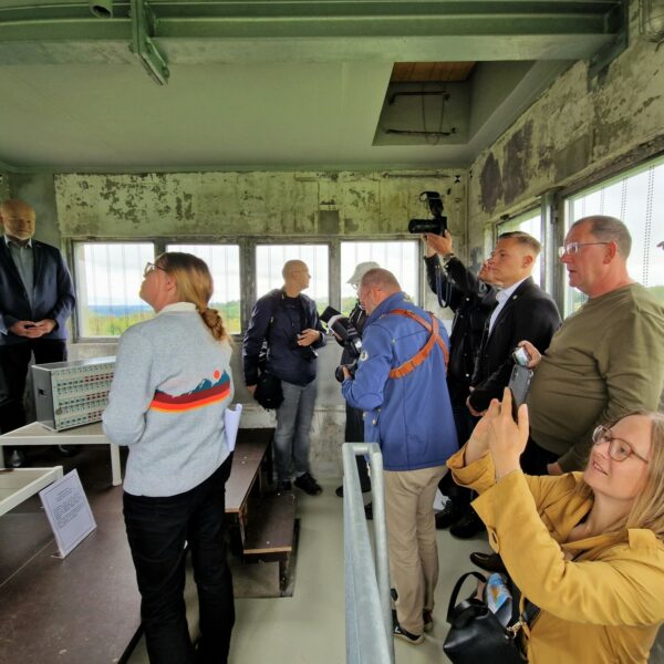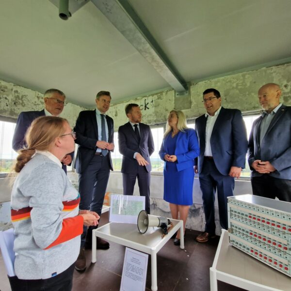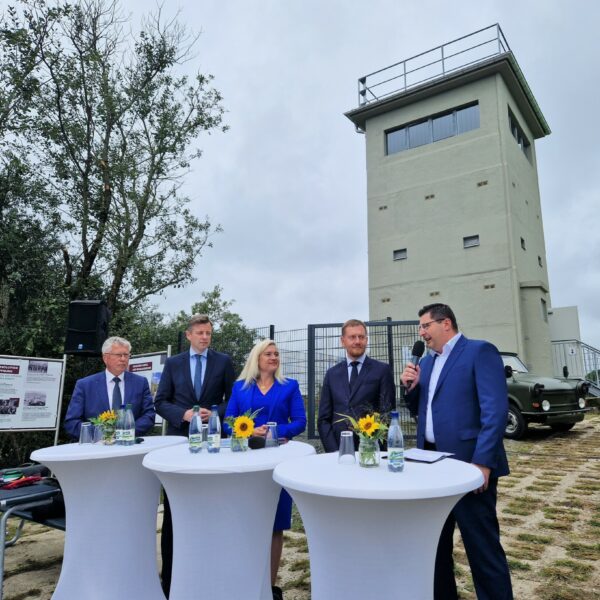 Bei einer Talk-Runde mit Ministerpräsident Michael Kretschmer, der bayerischen Staatsministerin für Europaangelegenheiten und Internationales, Melanie Huml, sowie den Landräten der Anrainer-Landkreise, die sich gemeinsam im Zweckverband engagieren, Dr. Oliver Bär (Hof), Thomas Fügmann (Saale-Orla-Kreis) und Gastgeber Thomas Henning (Vogtlandkreis) wurde an die Zeit der Teilung, des Mauerfalls und der Wiedervereinigung in der Region erinnert. Anschließend gab es die ersten Führungen in den Turm mit der Museumspädagogin des Deutsch-Deutschen Museums Mödlareuth, Susan Burger, an denen auch die anwesenden Zeitzeugen und Schülern des Lessing-Gymnasiums Plauen teilnahmen.