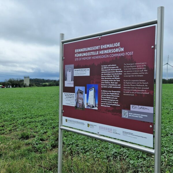 Der Grenzturm Heinersgrün im sächsischen Vogtland ist einer der letzten verbliebenen von einst über 800 sog. Führungsstellen und Wachtürmen entlang des ehemaligen Eisernen Vorhangs. 1978 kam dort ein Mensch beim Versuch, die Grenze zu überwinden, ums Leben. 2019 konnte der Vogtlandkreis den Turm erwerben, 2020 begannen die denkmalgerechten Sanierungsarbeiten. In Zusammenarbeit mit dem Deutsch-Deutschen Museum Mödlareuth wurde ein Nutzungskonzept entwickelt und Informationstafeln für den Außen- und Innenbereich erstellt.