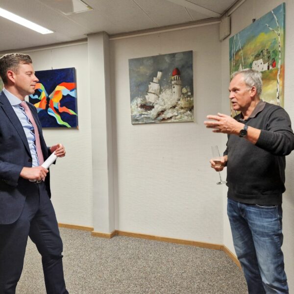 Die Bilder von der Ausstellungseröffnung zeigen den Künstler Reinhold Plass beim Rundgang durch die Ausstellung mit Landrat Dr. Bär.
