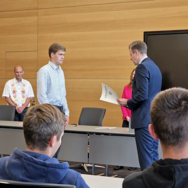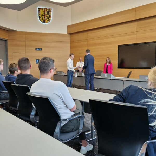 Julia Hagen und Tina Maar haben sich für die Ausbildung als Verwaltungsfachangestellte, Fachrichtung Kommunalverwaltung entschieden. Innerhalb der dreijährigen Ausbildung werden sie nun verschiedene Fachbereiche des Landratsamtes durchlaufen. Das Arbeitsspektrum reicht dabei von Themen wie Familie über die öffentliche Sicherheit bis hin zum Verkehrswesen. Jan Büttner und Jan Dalke beginnen ihre Ausbildung zum Straßenwärter.