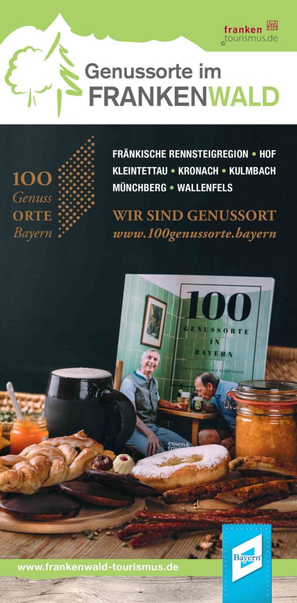 Im Frankenwald haben kulinarische Genüsse Tradition. Deshalb werben sieben prämierte Genussorte jetzt gemeinsam mit ihren Köstlichkeiten: die fränkische Rennsteigregion, Kleintettau, die Städte Kronach, Kulmbach, Münchberg und Hof sowie der Flößerort Wallenfels. Mit ihren regionaltypischen Leckerbissen wurden sie vom Bayerischen Landwirtschaftsministerium in den Kreis der „100 besten Genussorte in Bayern“ aufgenommen. Das Prädikat „Genussort“ erhalten Orte, die sich um den Erhalt besonderer Genusswerte verdient machen, kulinarische Traditionen bewahren und die Bedeutung von regionalen Spezialitäten vermitteln.