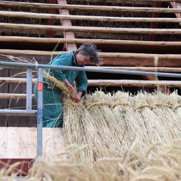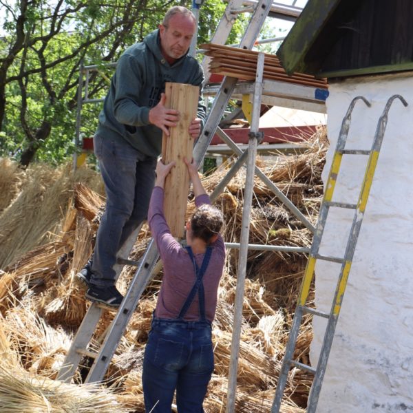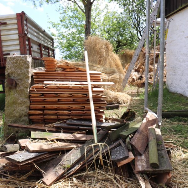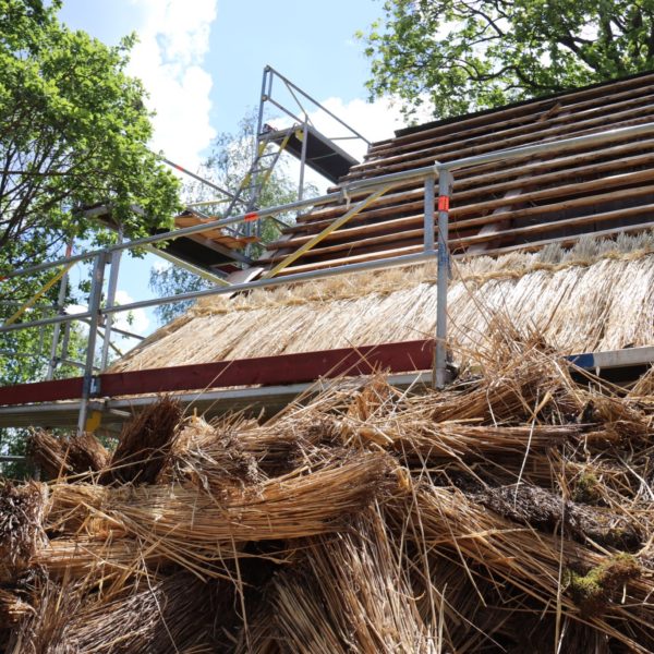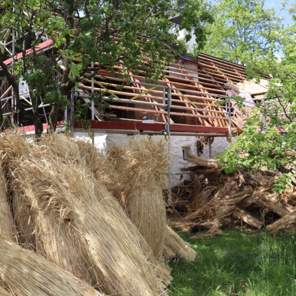 Das neue Dach war nötig geworden, weil das Stroh sowie die Holzschindeln und Holzdachrinne im Laufe der Jahre marode und undicht wurden. Zudem hatte der Marder an einigen Stellen des Daches Schäden verursacht.
