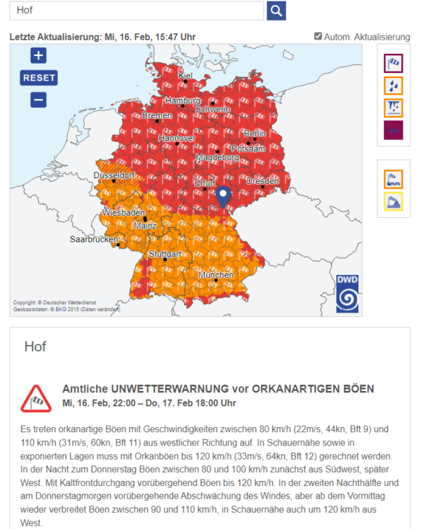 - VOR ORKANARTIGEN BÖEN von bis zu 120km/h in der Spitze, gültig von Mittwoch, 16.02.2022 (22:00 Uhr), bis Donnerstag, 17.02.2022 (18:00 Uhr).