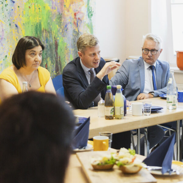 Ein wesentlicher Vorteil vor Ort ist die gewachsene und gute Vernetzung, wie Landrat Dr. Oliver Bär und Manuela Bierbaum, Geschäftsführerin der Diakonie Hochfranken im Gespräch mit der parlamentarischen Staatssekretärin berichten. Gleichzeitig machten beide auch auf die aktuellen Herausforderungen im Bereich der Kinder- und Jugendarbeit aufmerksam: