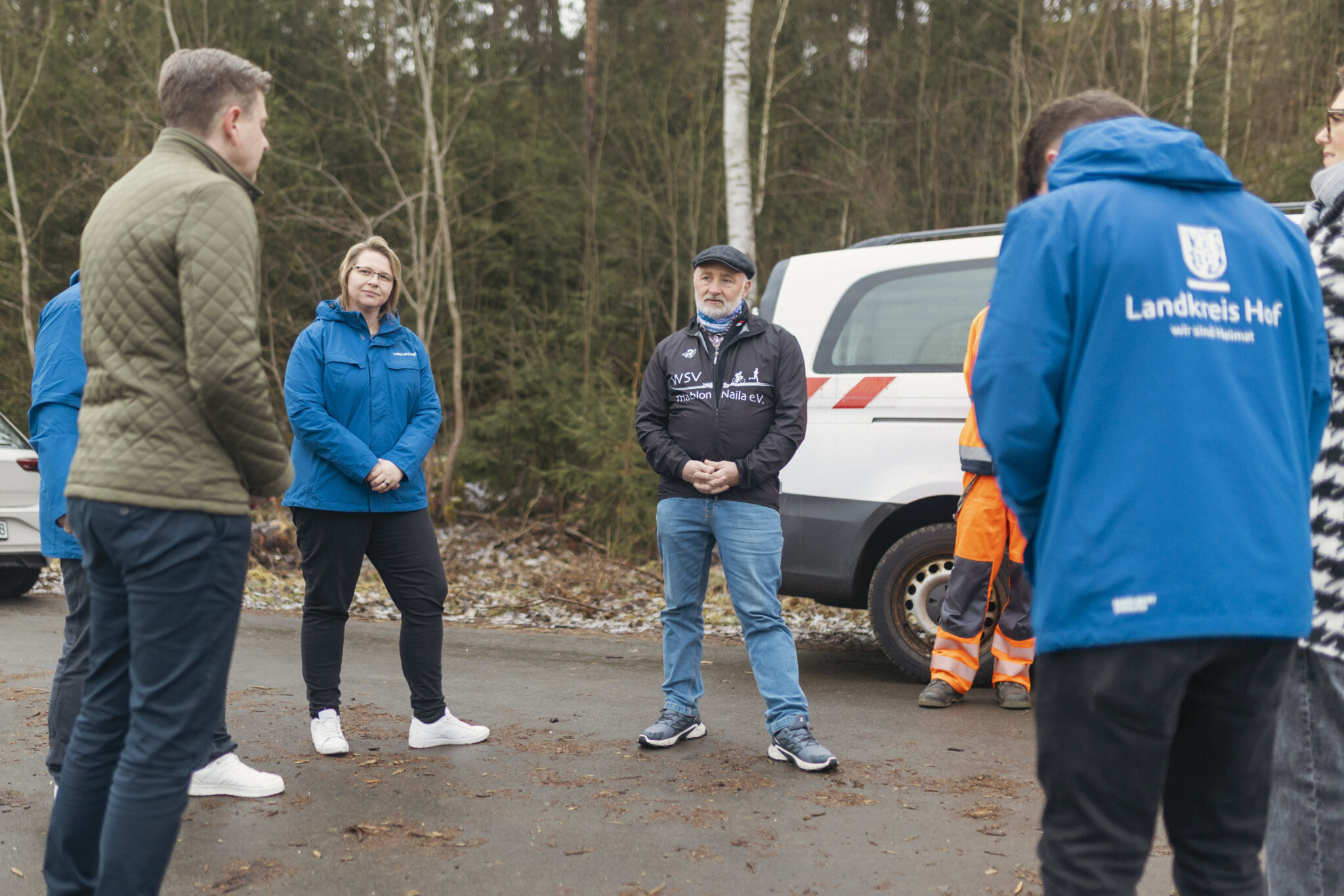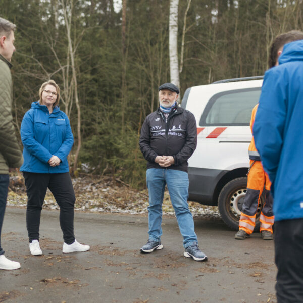 Auf dem Bild von links nach rechts: Richard Himes (Projektteam Smart City), Paul-Bernhard Wagner (Projektteam Smart City), Landrat Dr. Oliver Bär, Patricia Rubner (Bürgermeisterin Berg), Vanessa Wagner (Projektteam Smart City), Norbert Ittner (Kreisbauhof), Jürgen Wälzel (Fachbereichsleiter Tiefbau) und Rainer Voigt (Kreisbauhof).