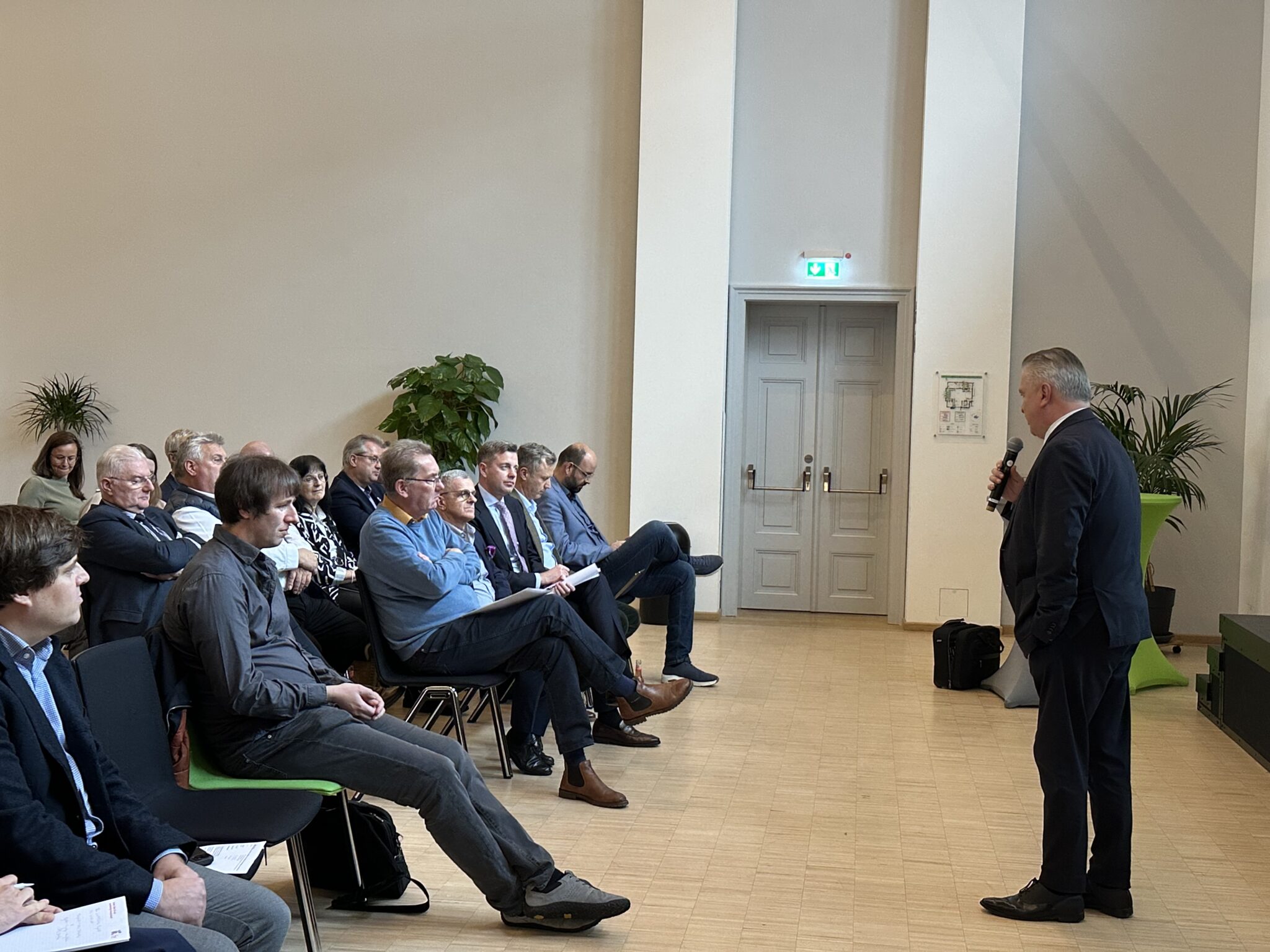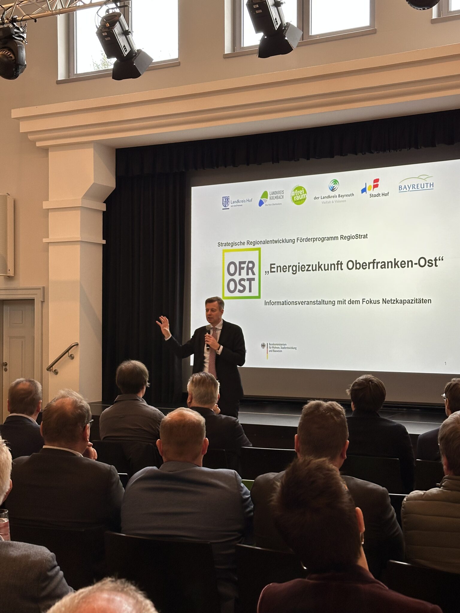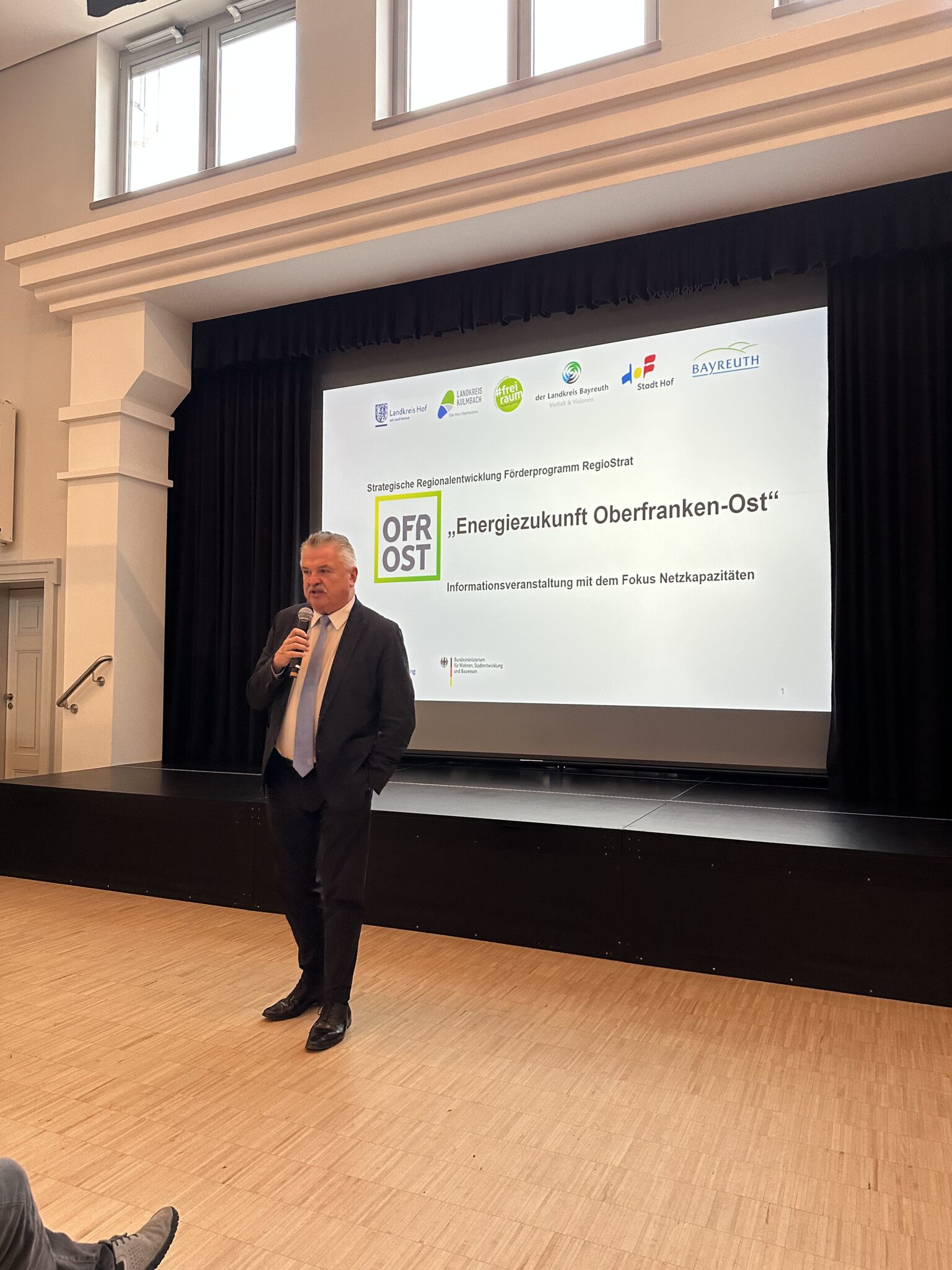 Zum Auftakt begrüßte Dr. Oliver Bär, Hofer Landrat und Vorsitzender des Regionalen Planungsverbands Oberfranken-Ost, die Gäste und betonte die Bedeutung einer abgestimmten regionalen Strategie für eine sichere, nachhaltige und bezahlbare Energieversorgung. Besonders hob er die Unterstützungsmöglichkeiten hervor, die Kommunen im Rahmen des Projekts künftig erhalten sollen. Auch Landrat Klaus Peter Söllner (Landkreis Kulmbach) begrüßte die Teilnehmenden und unterstrich die Wichtigkeit einer engen kommunalen Zusammenarbeit bei der Energiewende.