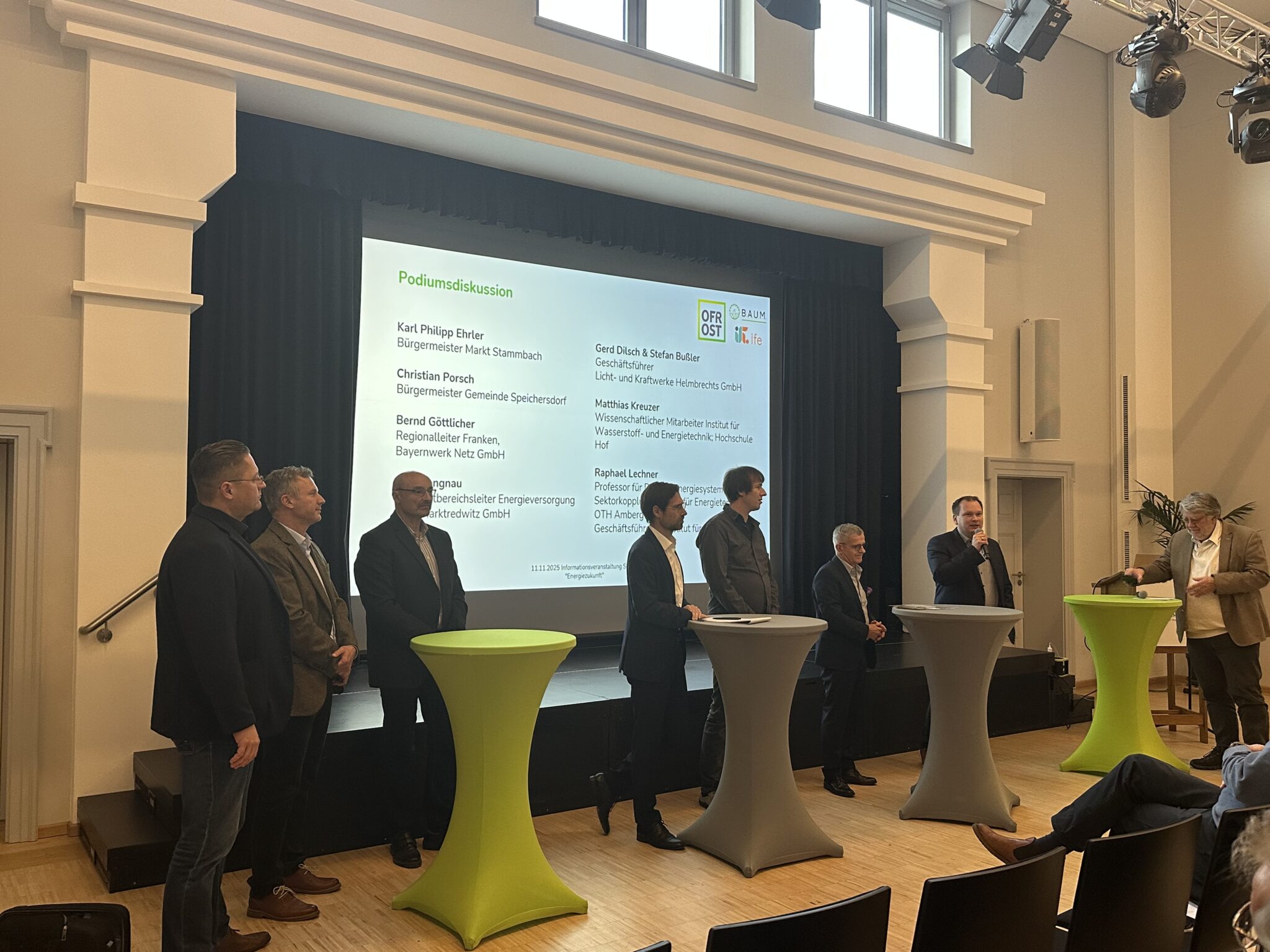 In der anschließenden Podiumsdiskussion unter Moderation von Ludwig Karg (BAUM Consult) diskutierten Vertreter aus Kommunalpolitik, Energiewirtschaft und Wissenschaft – darunter Karl Philipp Ehrler (Bürgermeister Markt Stammbach), Christian Porsch (Bürgermeister Gemeinde Speichersdorf), Bernd Göttlicher (Bayernwerk Netz), Felix Langnau (ESM Selb), Gerd Dilsch (LuK Helmbrechts) , Matthias Kreuzer (IWE, HAW Hof) und Prof. Dr. Raphael Lechner (OTH Amberg-Weiden) – über Netzausbau, Digitalisierung der Netze, Sektorkopplung, regionale Wertschöpfung, Bürgerbeteiligung, Wärmeversorgung und neue Modelle der dezentralen Energieversorgung.