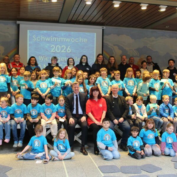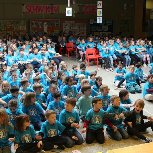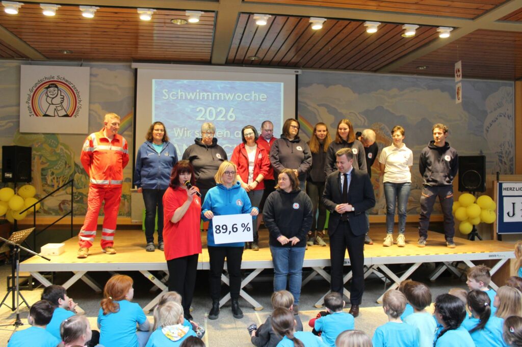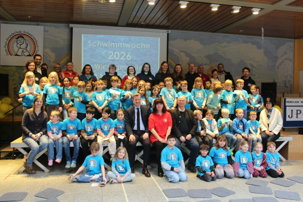 Wie in jedem Jahr fand die Vergabe der Abzeichen am Freitag nach der letzten Schwimmstunde im Rahmen einer musikalisch eingebetteten Veranstaltung statt. Landrat Dr. Oliver Bär unterstrich die Bedeutung des Projektes. Fast 90 Prozent aller Kinder der Jean-Paul-Grundschule können aktuell schwimmen – während der Trend deutschlandweit immer weiter sinkt.