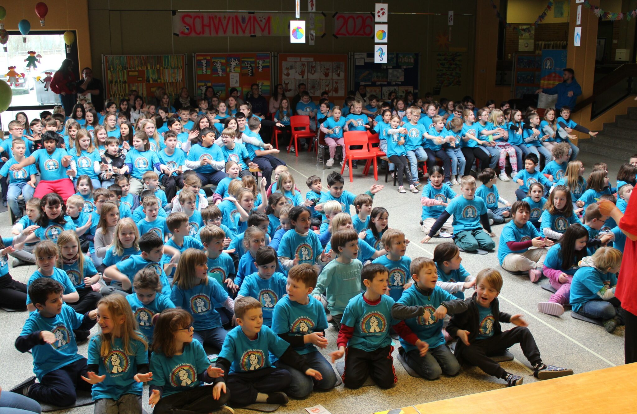 Alle 202 Schülerinnen und Schüler der Jean-Paul-Grundschule, die Lehrkräfte, das Team der Wasserwacht, zahlreiche Mitglieder des Elternbeirats, einige Eltern aus dem Helferteam sowie geladene Gäste kamen zur Abschlussveranstaltung, um die Kinder gebührend zu feiern, die Bedeutung des Projektes hervorzuheben und ihre Unterstützung kundzutun.