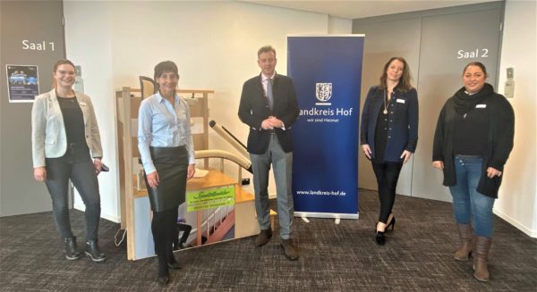 Bild (v.l.): Lisa-Maria Moritz (Integriertes Gesamtkonzept für Senioren und Inklusion), Ute Hopperdietzel (Fachstelle für Demenz und Pflege Oberfranken), Landrat Dr. Oliver Bär, Alexandra Puchta (Netzwerk Pflege Stadt/Landkreis Hof), Tina Bauer (Wohnberatung Landkreis Hof)