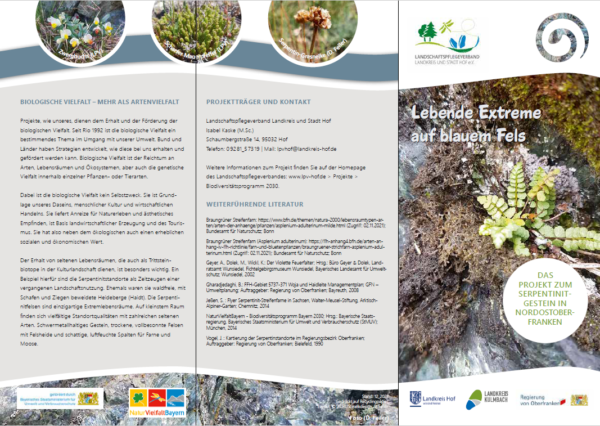 Nun hat der LPV unter dem Titel „Lebende Extreme auf blauem Fels“ einen Flyer herausgegeben, der über das Biodiversitätsprojekt zum Serpentinitgestein in Nordostoberfranken sowie über diesen einzigartigen Lebensraum informiert. Darin werden u. a. die Besonderheiten des Serpentinits erklärt und seine schützenswerte Pflanzen- und Tierwelt dargestellt. Interessierte Leserinnen und Leser erfahren so z.B. mehr über den Braungrünen Streifenfarn, die Serpentin-Grasnelke und den Violetten Feuerfalter.