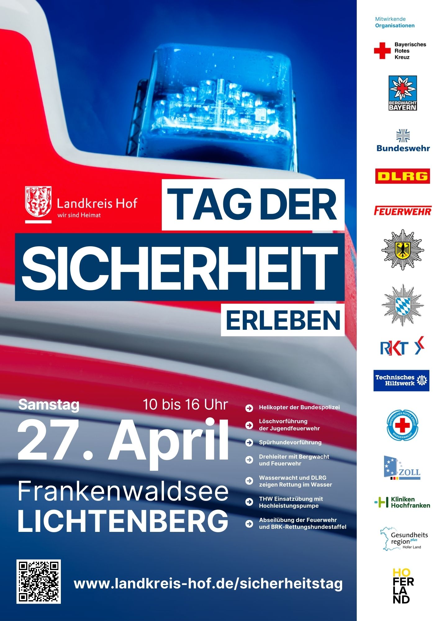 „Das Engagement unserer Einsatzkräfte im Hofer Land – egal ob haupt- oder ehrenamtlich - ist herausragend. Es freut mich sehr, dass wir sämtliche Blaulichtorganisationen unserer Region für die Veranstaltung gewinnen konnten und wir so die riesige Bandbreite an Sicherheitsorganisationen erlebbar machen können“, so Landrat Dr. Bär.