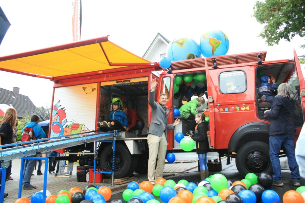 Was ist das Spiel- und Jugendmobil des Landkreises Hof? Es ist ein ehemaliges Feuerwehrauto, das dorthin fährt, wo es zum gemeinsamen Spielen und Bekämpfung von Langeweile gebraucht wird. Es ist ausgestattet mit großen und kleinen Spielgeräten, Sachen zum Experimentieren, Konstruieren und Kochen, mobilem Kino, einer laute DJ-Musikanlage, Sport- und Kletterausrüstung, einem großen Zelt und Pavillons, Bastel- und Malsachen und vielem mehr.