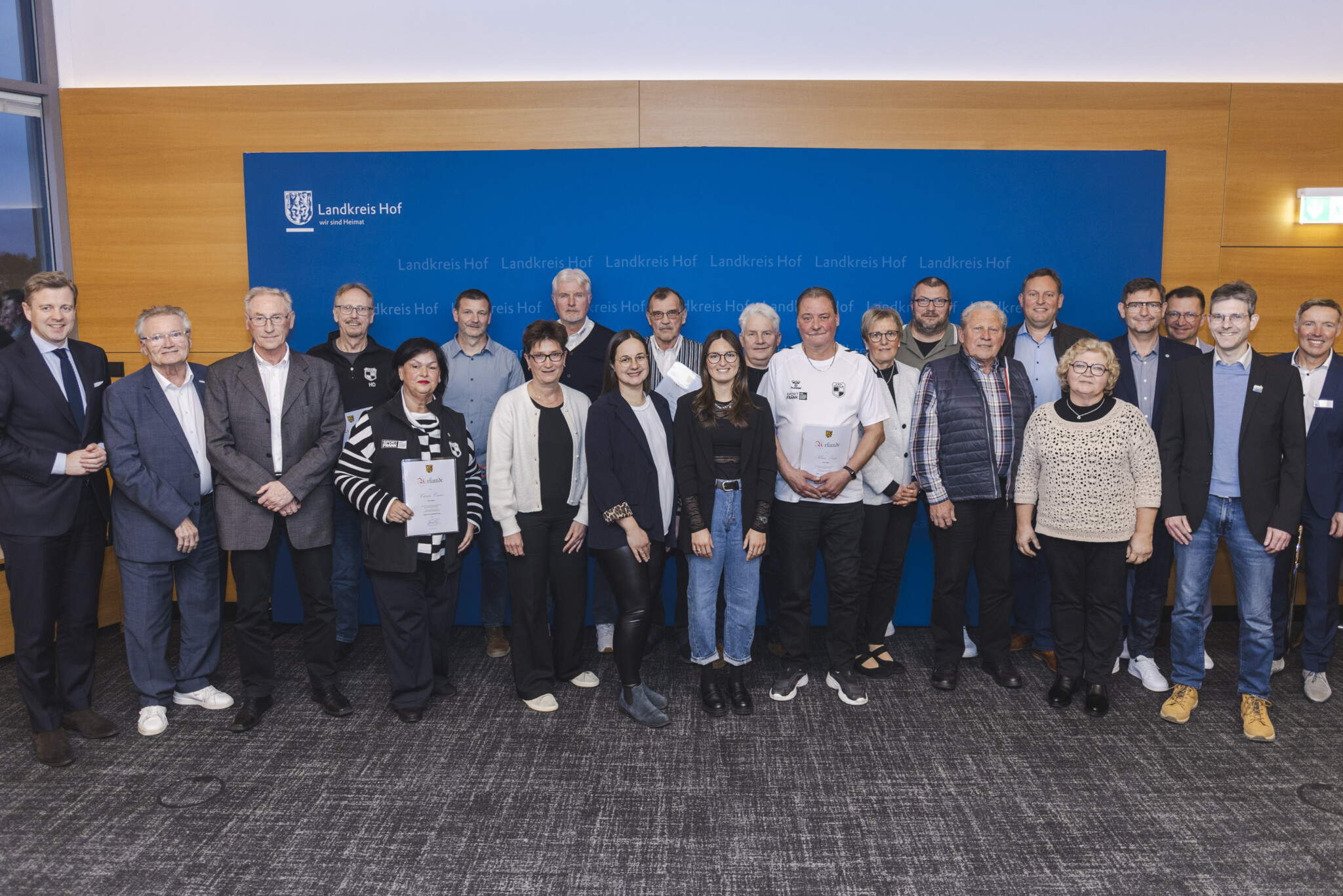Insgesamt 21 Funktionäre aus fünf Sportvereinen im Landkreis Hof wurden von Landrat Dr. Oliver Bär für ihren langjährigen ehrenamtlichen Einsatz in der Region geehrt – sie kommen gemeinsam auf 517 Jahre Engagement in ihren Vereinen.