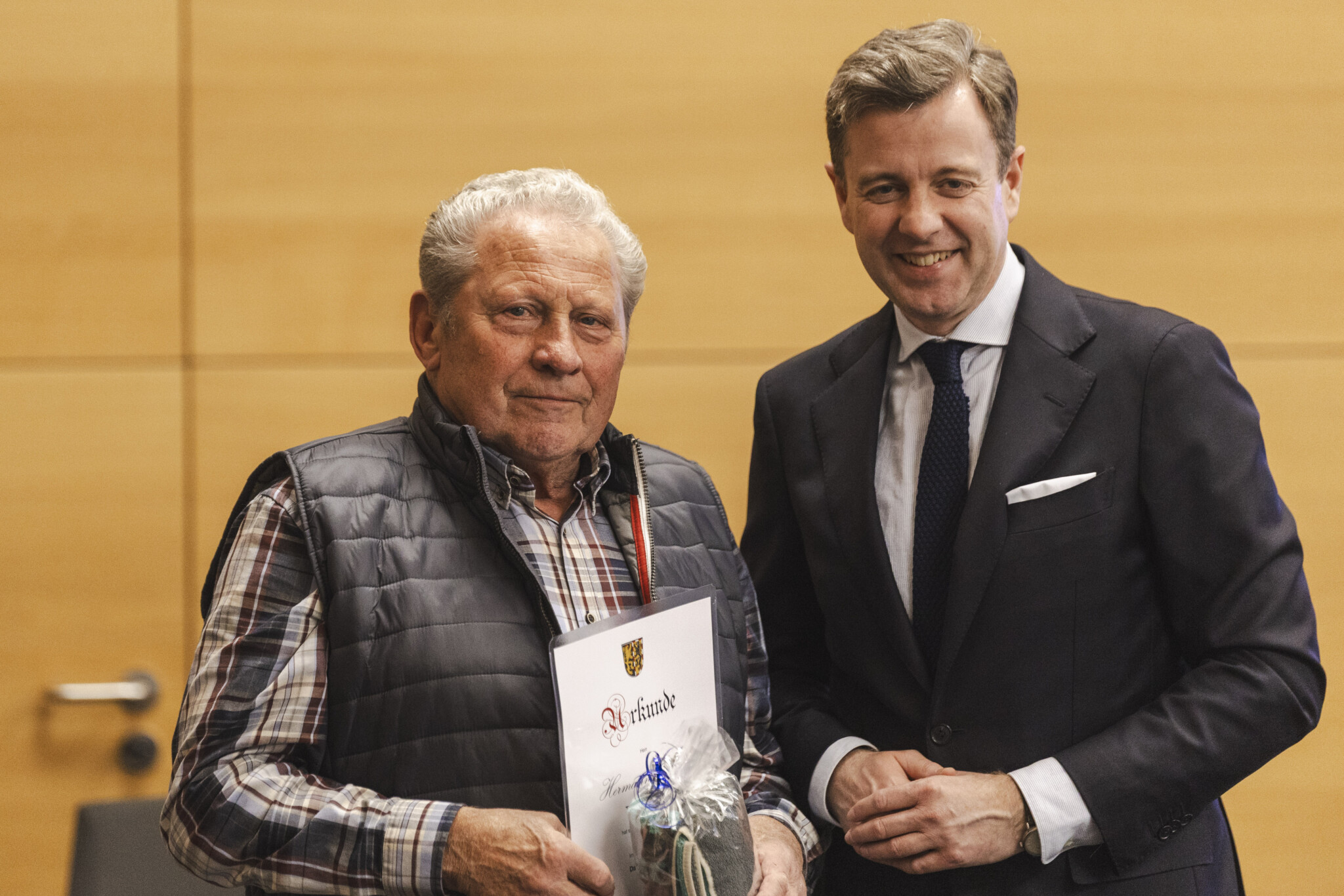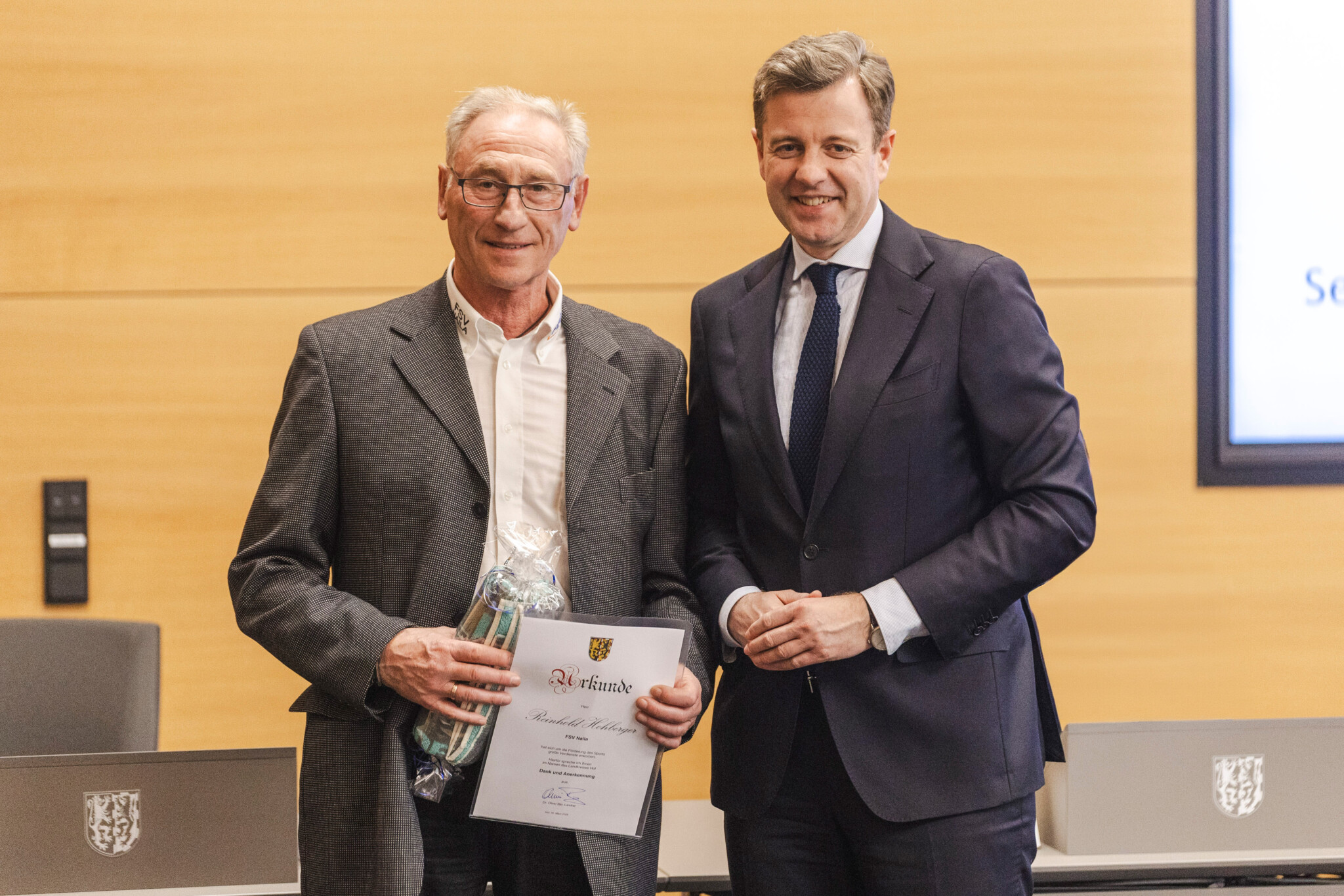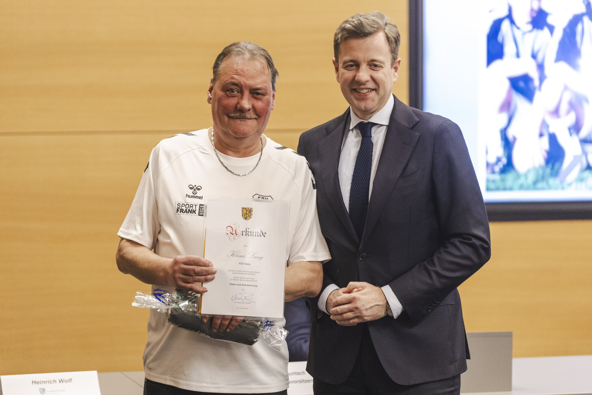 Insgesamt 21 Funktionäre aus fünf Sportvereinen im Landkreis Hof wurden von Landrat Dr. Oliver Bär für ihren langjährigen ehrenamtlichen Einsatz in der Region geehrt – sie kommen gemeinsam auf 517 Jahre Engagement in ihren Vereinen.