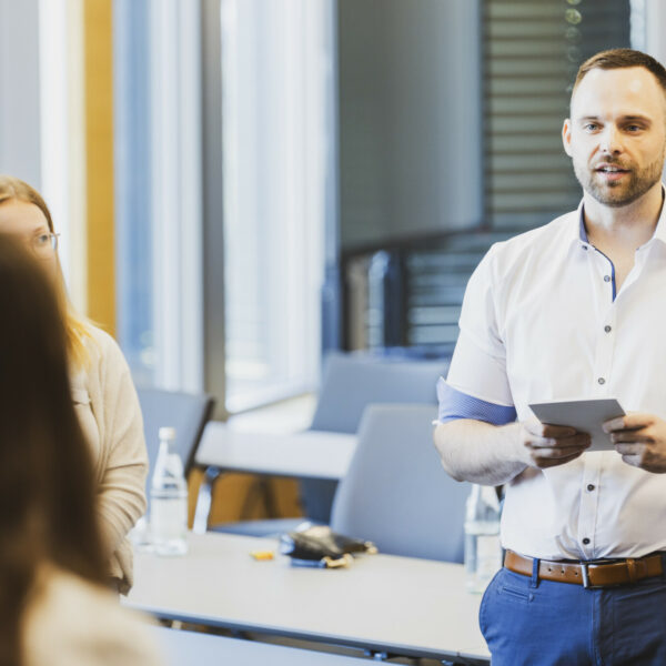 Mit zum Tagesprogramm gehörte es, sich in Gruppen aufgeteilt gegenseitig kennenzulernen, um dann den Anderen das Gegenüber vorzustellen. So erfuhren alle etwas zum persönlichen Hintergrund, Interessen, Ehrenämtern und dem bisherigen Ausbildungsweg der neuen Kollegen. Nach der ausführlichen Vorstellungsrunde wurden die Beamtenanwärter und –anwärterinnen durch Landrat Dr. Oliver Bär ernannt und vereidigt.