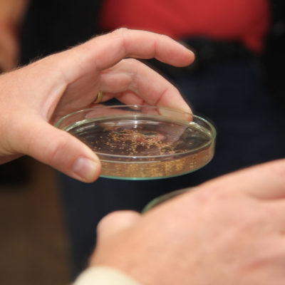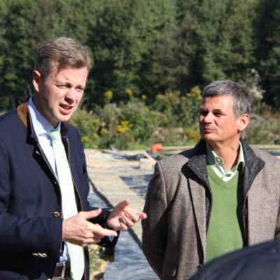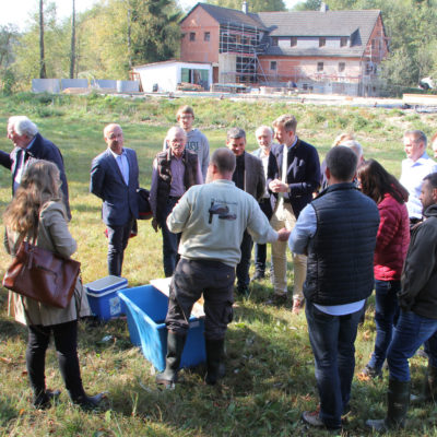 Startschuss im Landkreis Hof für die Zucht der Flussperlmuschel: Ab jetzt wird in der Huschermühle im Dreiländereck bei Regnitzlosau für den Erhalt der vom Aussterben bedrohten Tierart gesorgt. Ulrich Scharfenberg, Kreisvorsitzender des Bund Naturschutz und Wolfgang Degelmann, Geschäftsführer des Bund Naturschutz und Leiter der Zuchtanlage, haben Landrat Dr. Oliver Bär und mehreren Kreisräten das Projekt vorgestellt.