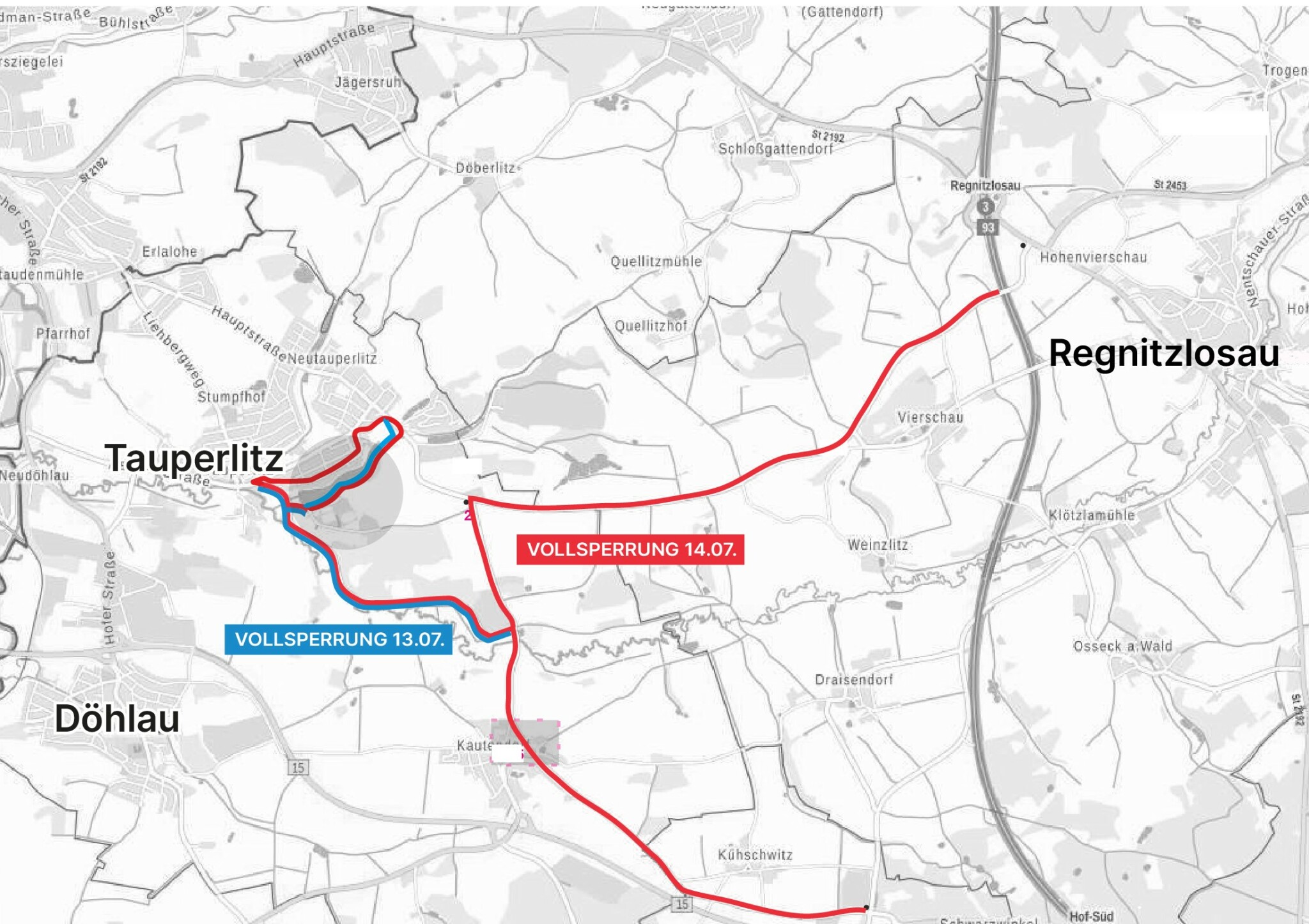 Auf den Straßen Am See und Waldsteinweg in Tauperlitz wird am 14.07.2024 zudem das Halten auf beiden Fahrbahnseiten verboten. Der unbedingt notwendige Anliegerverkehr ist nur in Abstimmung mit der Polizei, der Feuerwehr oder Verkehrsposten des Veranstalters zulässig.