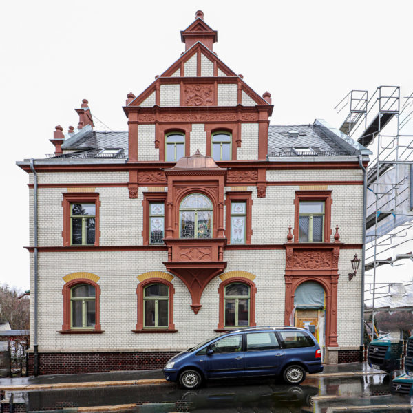 Der zweigeschossige traufständige Massivbau mit Ziergiebeln und Erkern, weißglasierter Klinkerfassade und einer Gliederung aus rotem Sandstein wurde 1904 erbaut. Eine besondere Betonung erhält das Baudenkmal durch den reich ausstaffierten Erker aus rotem Sandstein im Obergeschoss. Den Hauseingang schmückt ein ornamentaler Steinzeugbelag. Im Inneren überrascht die noch weitgehend erhaltene, vom Jugendstil geprägte Originalausstattung. Zur reichen Ausstattung gehören die farbige Bleiverglasung, Stuck- und Kassettendecken, Kachelöfen, Füllungstüren mit Beschlägen sowie die Lincrusta-Tapete im Entree und im Treppenhaus.