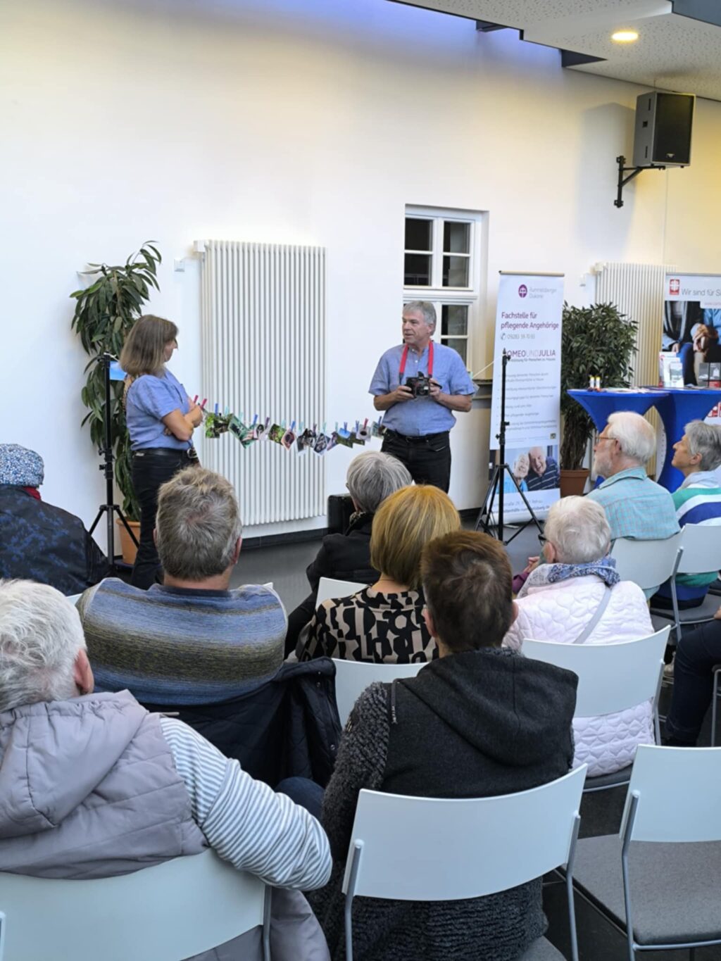 Kürzlich konnte die Lokale Allianz für Menschen mit Demenz im Hofer Land mit dem Stück „Das ICH verreist“ des Theaters „Das Baumann“ aus Kulmbach 60 Gäste in der VHS Hofer Land begeistern. Rüdiger und Birgit Baumann schafften es in kurzer Zeit Menschen verstehen zu lassen, wie sich aus einer normalen Altersvergesslichkeit eine Demenz entwickeln kann. Wörter fehlen, Erinnerungen verblassen, eigene Defizite werden versucht zu überspielen. Einige aus dem Publikum erkannten bekannte Veränderungen ihrer Angehörigen und sprachen im Nachgang offen mit den Beraterinnen der Lokalen Allianz über ihre Situation.