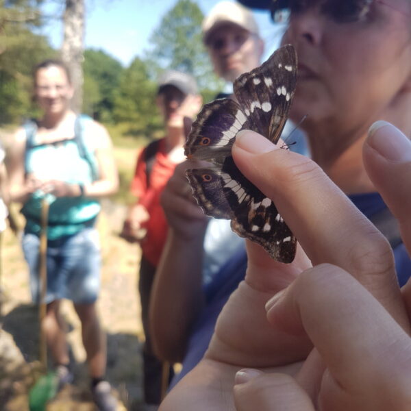 Anfang Juli gab es für Interessierte die Möglichkeit, an einer Schmetterlings- und Heuschreckenexkursion am Haidberg teilzunehmen. Bei strahlendem Sonnenschein konnte die Biologin Anja Hager die Teilnehmerinnen und Teilnehmer für die hüpfenden und fliegenden Insekten vor Ort begeistern. Viele Schmetterlinge gab es zu keschern, jedoch wenige Arten. Unter anderem flogen zahlreiche Braunaugen, aber auch einige Schillerfalter, die alle nach der Bestimmung wieder freigelassen wurden.