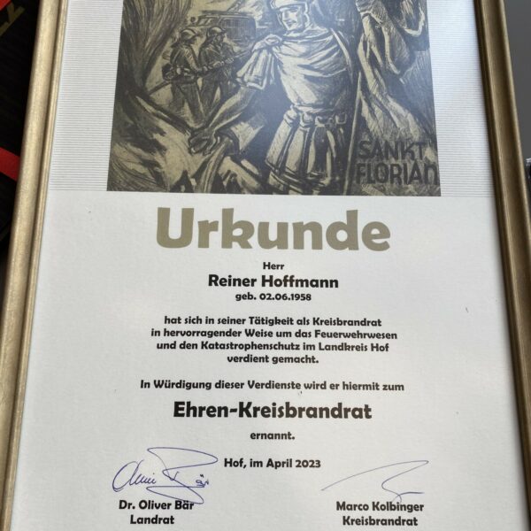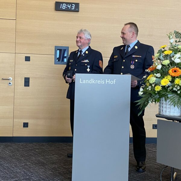 Zehn Jahre war Reiner Hoffmann Kreisbrandrat des Landkreises Hof. In einer Feierstunde im Landratsamt wurde er nun verabschiedet und zum Ehrenkreisbrandrat ernannt. Sein Nachfolger Marco Kolbinger, der das Amt zum 1. April übernommen hat, wurde offiziell eingeführt.