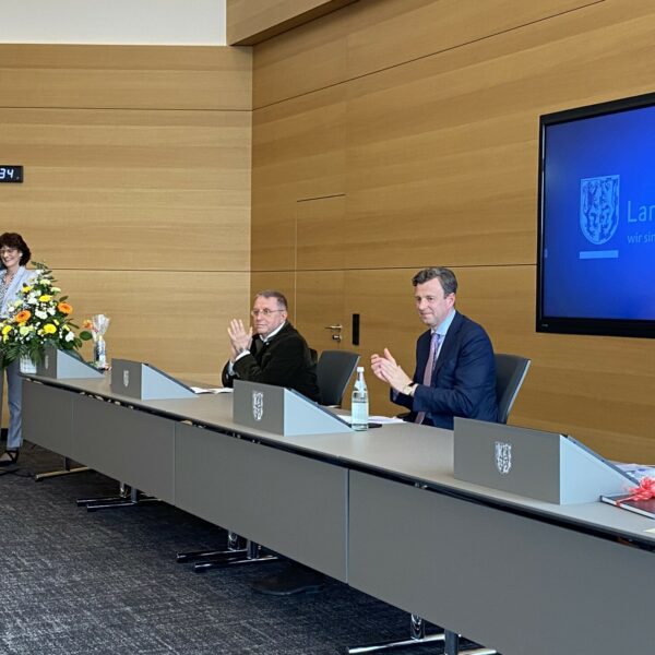 Landrat Dr. Oliver Bär würdigte in seiner Ansprache die Leistungen Reiner Hoffmanns. Er habe ein Leben für die Feuerwehr gelebt. Die große Verantwortung des Amtes sei am Ende auch die Verantwortung dafür, dass der Feuerschutz in der Region gewährleistet sei. „Reiner Hoffmann hatte einen 365-Tage-Job und das 24 Stunden. Er hat immer ein Gefühl des Vertrauens vermittelt, war stets ein guter Ansprechpartner der Feuerwehren, die Zusammenarbeit mit anderen Hilfsorganisationen war von großer Kollegialität geprägt. Ich danke Ihnen für Ihre Sympathie, Ihr ausgleichendes Wesen und das Wissen um jeden einzelnen in der Feuerwehr.“ Augenzwinkernd fügte er hinzu: „Bevor Rainer Hoffmann Kreisbrandrat wurde, gab es im Landkreis keinen Katastrophenfall. In seiner Amtszeit schon zwei.“