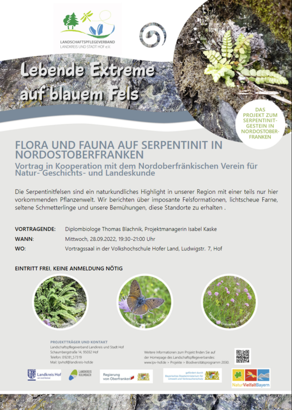 Herzliche Einladung zu unserem Vortrag über die einzigartigen Pflanzen- und vorkommenden Tierarten auf den seltenen Serpentinitstandorten in unserer Region am 28.09.2022, 19:30 Uhr in der VHS Hofer Land.