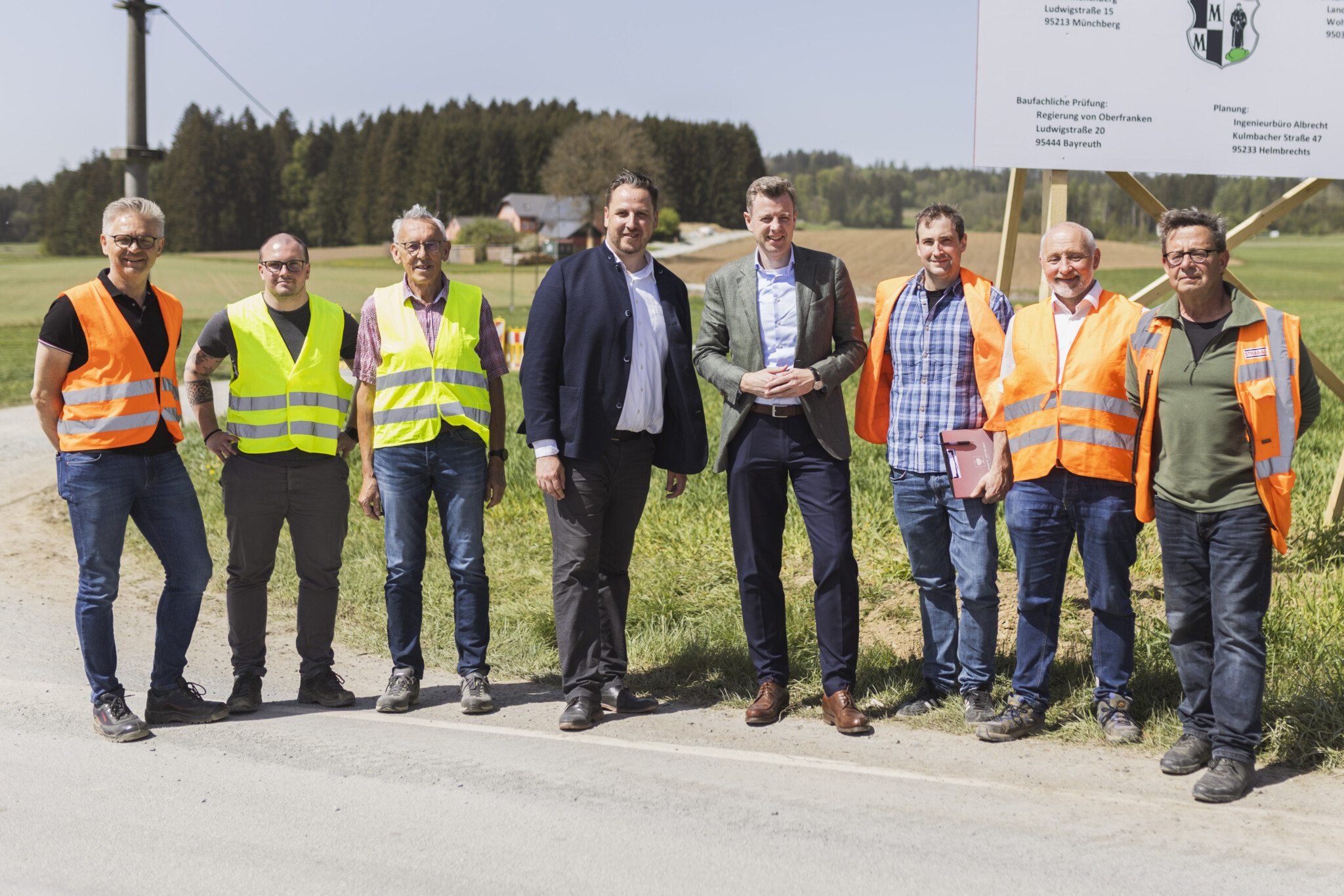 Im Gruppenbild von links nach rechts: Alexander Künzl (Mitarbeiter Fachbereich Tiefbau Landratsamt Hof), Christian Horn (Ingenieurbüro Albrecht), Dieter Albrecht (Ingenieurbüro Albrecht), Bürgermeister Christian Zuber (Stadt Münchberg), Landrat Dr. Oliver Bär, Thomas Hörl (Leitung Tiefbau Stadt Münchberg), Jürgen Wälzel (Fachbereichsleiter Tiefbau Landratsamt Hof), Bauleiter Jörg Rauh (STRABAG AG)