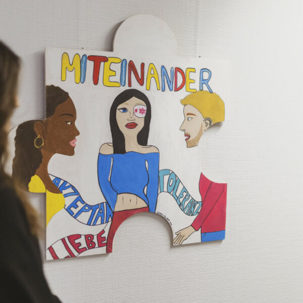 Die Wanderausstellung unter dem Motto „Wir sind bunt“ geht jetzt in die nächste Runde. Ein Teilbereich der Ausstellung ist dabei dem Projekt „Schule ohne Rassismus – Schule mit Courage“ gewidmet. Hier geht es darum, das soziale Klima an Schulen aktiv mitzugestalten, indem man sich bewusst gegen jede Form von Diskriminierung, Mobbing und Gewalt wendet. Um diese Themen darzustellen, haben die jungen Künstlerinnen und Künstler große Puzzleteile thematisch bemalt, die nun in der Galerie zu entdecken sind.