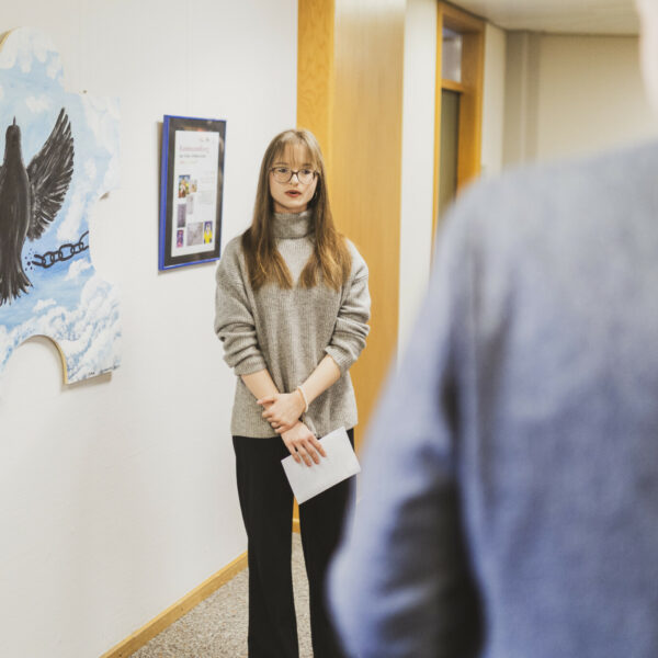 Landrat Dr. Oliver Bär eröffnete die Ausstellung und zeigte sich begeistert vom Projekt und davon, wie stark sich die jungen Leute in ihren Schulen für diese wichtigen Themen einsetzen. Auch freute er sich über die vielen positiven Botschaften in dieser Ausstellung.