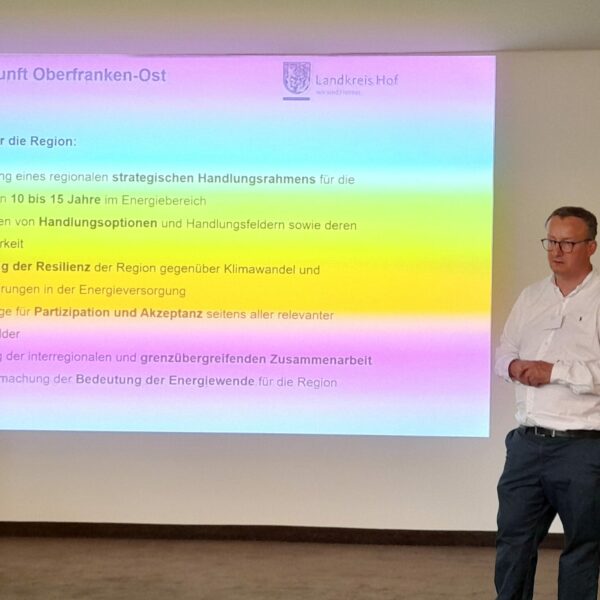 Mit dem Energiestrategie-Projekt „Energiezukunft Oberfranken-Ost“ haben sich die sechs Gebietskörperschaften der Planungsregion Oberfranken-Ost (die Landkreise Hof, Wunsiedel i.Fichtelgebirge, Bayreuth und Kulmbach sowie die kreisfreien Städte Hof und Bayreuth) gemeinsam mit dem Regionalen Planungsverband Oberfranken-Ost auf den Weg gemacht, um zukunftsweisende Strategien für eine nachhaltige Energieversorgung zu entwickeln. Die Förderung durch das Bundesministerium für Wohnen, Stadtentwicklung und Bauwesen (BMWSB) ermöglicht eine tiefgehende Analyse regionaler Energiepotenziale und die Erarbeitung praxisnaher Handlungsempfehlungen. Ziel ist es, die Region als attraktiven Wirtschafts- und Lebensraum zu erhalten, die regionale Wertschöpfung zu steigern und Unternehmen sowie Einwohnern langfristig bezahlbare Energie bereitzustellen. Auch grenzübergreifende Potenziale mit Sachsen, Thüringen und Tschechien werden in den Betrachtungen einbezogen.