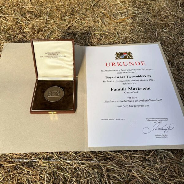 An den Betrieb Marktstein geht der Preis für seine artgerechte Schweinehaltung im Außenklimastall auf Stroh. Trotz unsicherer Zeiten habe die Familie einen Stallneubau gewagt und zum Wohl der Tiere sogar sichere Arbeitsplätze außerhalb der Landwirtschaft an den Nagel gehängt, heißt es in der Begründung der Juroren. Wo andere Betriebe aufgeben, habe Familie Markstein kräftig investiert – in die Ferkelaufzucht und -mast, in Ferienwohnungen und betriebseigenes Wirtshaus. Die Verarbeitung der Tiere über ortsansässige Metzger und das eigene Wirtshaus stärkt die regionale Vermarktung und sorgt für kurze Wege, einer der Grundsteine für das erfolgreiche Gesamtkonzept des Betriebes.